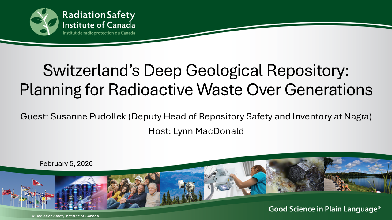This recorded webinar examines Switzerland’s approach to the long-term management and disposal of radioactive waste and spent nuclear fuel. Guest speaker Susanne Pudollek, Deputy Head of Repository Safety and Inventory at Nagra, Switzerland’s National Cooperative for the Disposal of Radioactive Waste, explains the scientific and regulatory basis for deep geological disposal and outlines how Switzerland’s program has progressed after decades of research and site selection. The presentation is followed by a question-and-answer period. The final 20 minutes is a wellness session of beginner Tai Chi with Charlmane Wong of Ji Hong Tai Chi and Qi Gong of Richmond Hill Ontario.